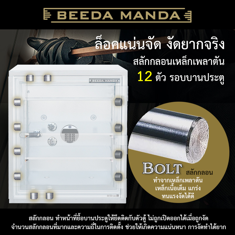- สลักกลอน 12 ตัว ทำจากเหล็กเพลาตัน ไม่หักงอง่ายเมื่อถูกงัด