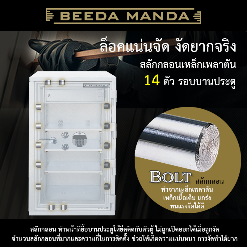 - สลักกลอน 14 ตัว ทำจากเหล็กเพลาตัน ไม่หักงอง่ายเมื่อถูกงัด
