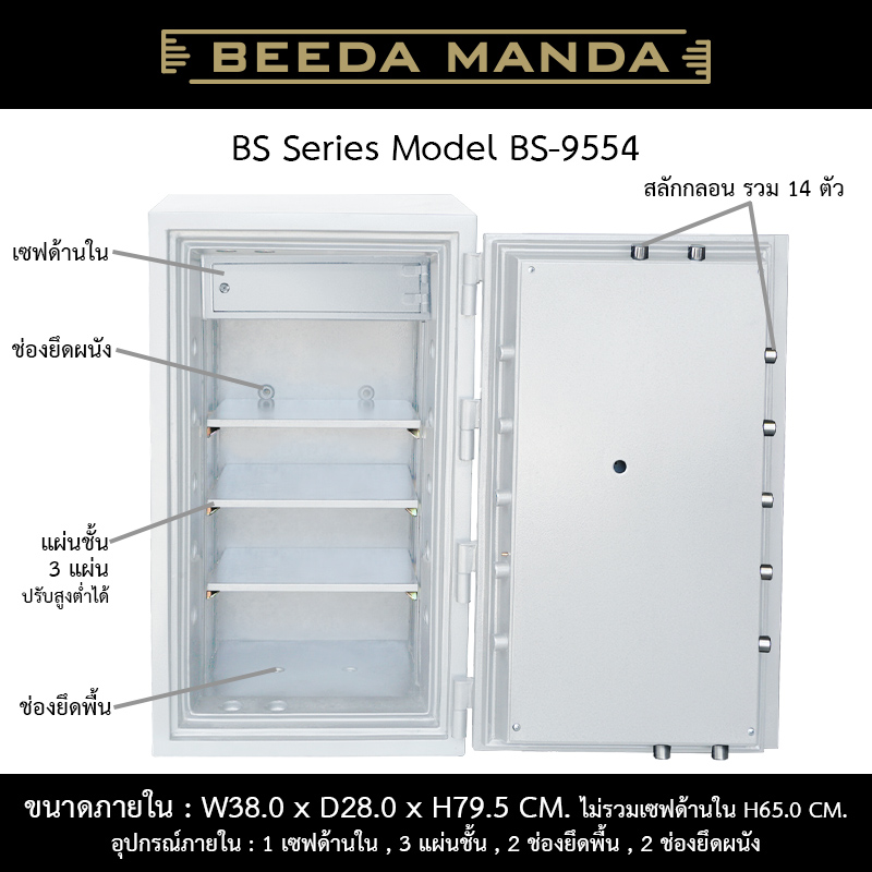 - มีช่องยึดพื้น 2 ช่องและผนัง 2 ช่องจากด้านในตู้ เพื่อป้องกันตู้เซฟถูกขโมยด้วยการยก