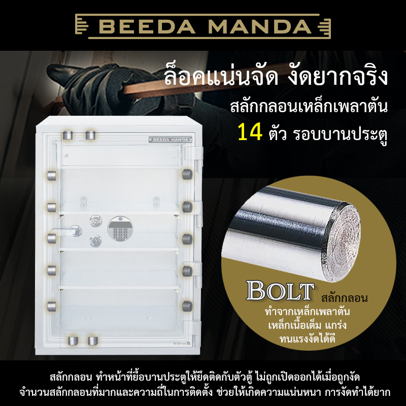 - สลักกลอน 14 ตัว ทำจากเหล็กเพลาตัน ไม่หักงอง่ายเมื่อถูกงัด