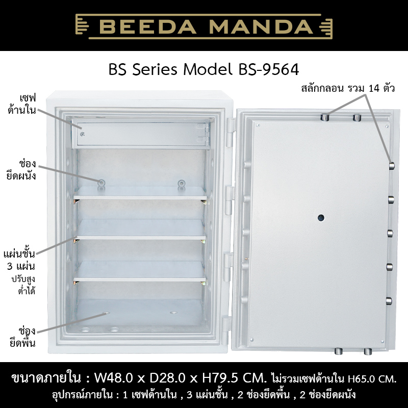 - มีช่องยึดพื้น 2 ช่องและผนัง 2 ช่องจากด้านในตู้ เพื่อป้องกันตู้เซฟถูกขโมยด้วยการยก