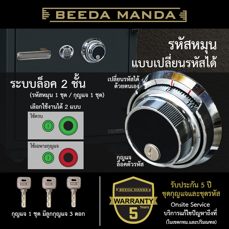 - รหัสหมุน 1 ชุด / กุญแจ 1 ชุด (ลูกกุญแจ 3 ดอก/ชุด)