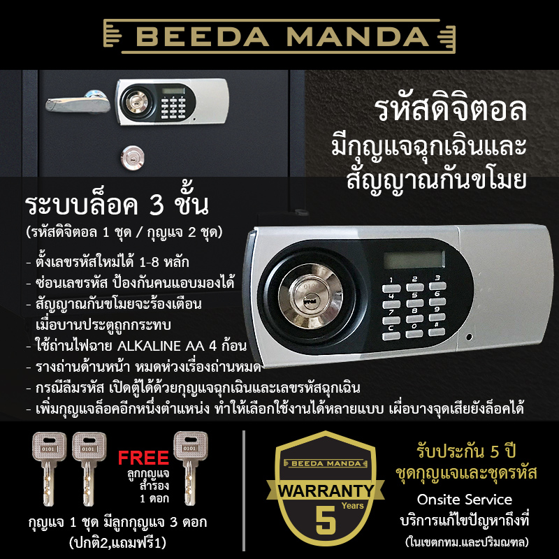 ระบบล็อค : ล็อค 3 ชั้น (รหัสดิจิตอล 1 ชุด/กุญแจ 2 ชุด) เปลี่ยนรหัสได้