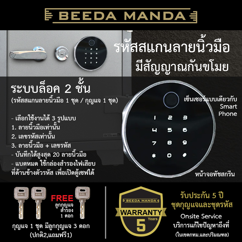 - ระบบล็อค 2 ชั้น (รหัสสแกนลายนิ้วมือ 1 ชุด / กุญแจ 1 ชุด)
