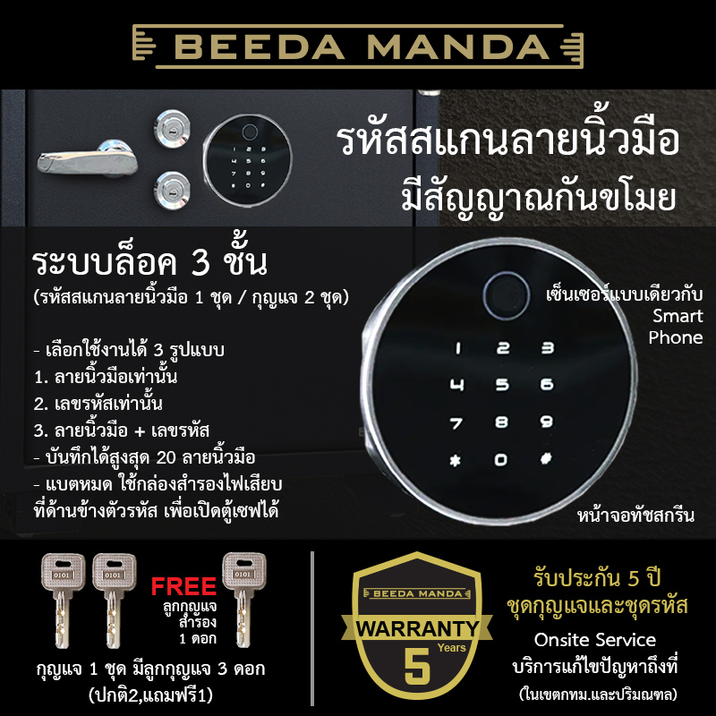 - ระบบล็อค 3 ชั้น (รหัสสแกนลายนิ้วมือ 1 ชุด / กุญแจ 2 ชุด)